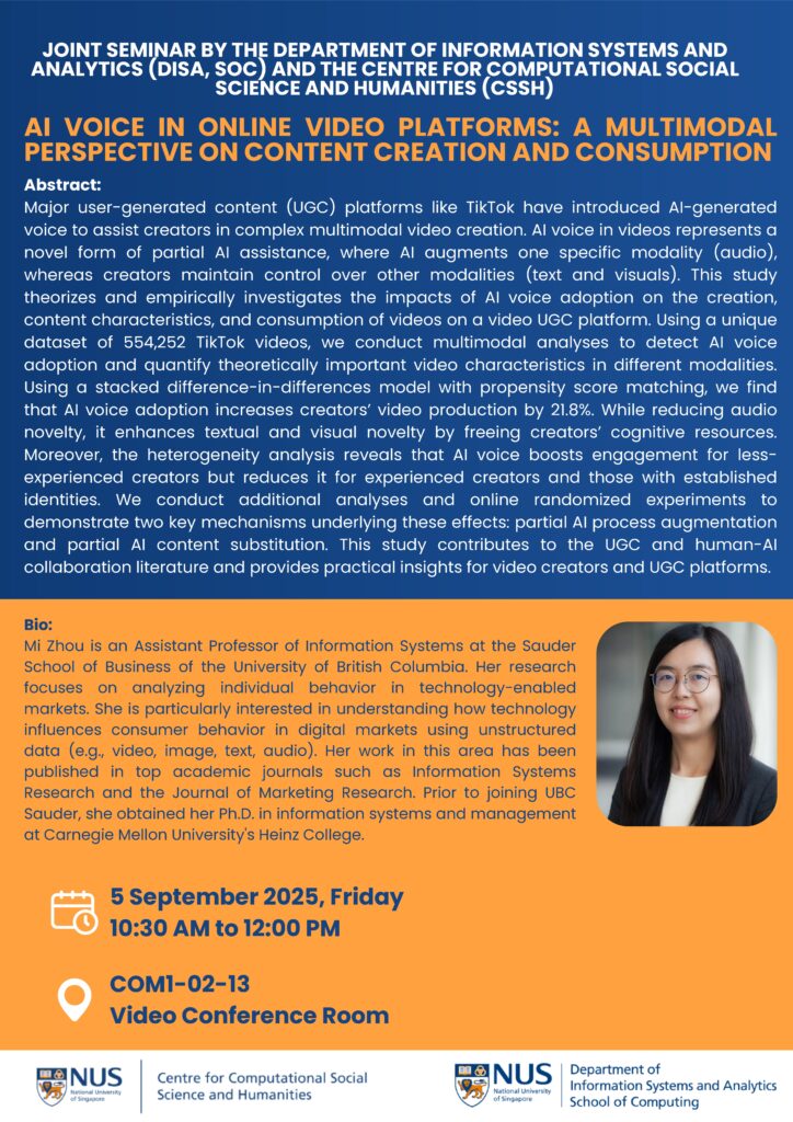 Mi Zhou is an Assistant Professor of Information Systems at the Sauder School of Business of the University of British Columbia. Her research focuses on analyzing individual behavior in technology-enabled markets. She is particularly interested in understanding how technology influences consumer behavior in digital markets using unstructured data (e.g., video, image, text, audio). Her work in this area has been published in top academic journals such as Information Systems Research and the Journal of Marketing Research. Prior to joining UBC Sauder, she obtained her Ph.D. in information systems and management at Carnegie Mellon University’s Heinz College.